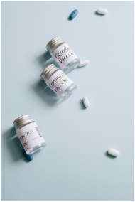 Top view of coronavirus vaccine vials and assorted pills on a blue surface.