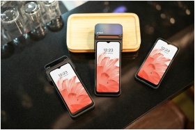 Close-up of three modern smartphones displaying a floral wallpaper, placed on a black surface.