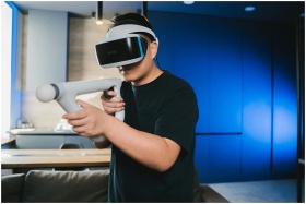 A man using a virtual reality headset and controll