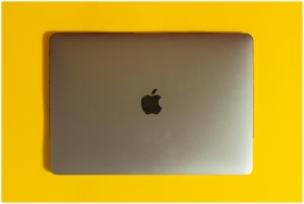 A modern laptop with a sleek design on a bright yellow surface, emphasizing minimalism.