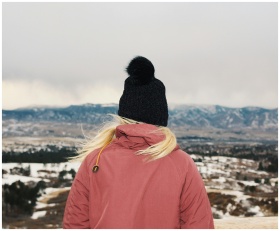 A woman in a pink jacket and beanie overlooks a sn