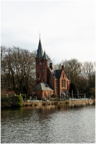 A picturesque Gothic building along a serene canal in Bruges, Belgium.