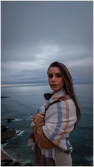 A woman stands wrapped in a blanket, gazing at the ocean during twilight. A serene and contemplative moment by the sea.