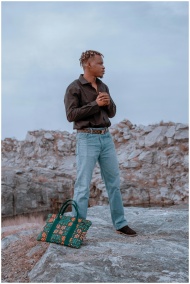 Man in stylish outfit posing on rocky landscape with bag, showcasing fashion outdoors.