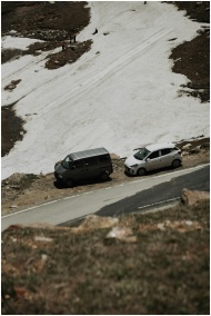 Two vehicles parked by a snowy mountain roadside d
