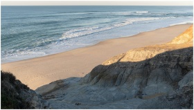 Peaceful beach scene with crashing waves at Nazaré, Portugal, during daytime.
