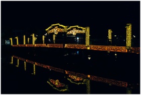 A beautifully lit bridge at night with intricate patterns reflecting in the calm water.
