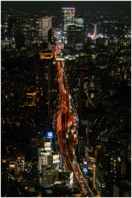 Aerial night view of Tokyo cityscape with illuminated streets and skyscrapers.