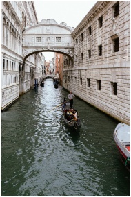 Gondolas glide under the iconic Bridge of Sighs in
