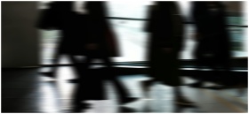 Abstract blurred motion of people walking indoors, depicting urban life and busy routines.