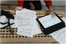 A musician analyzes sheet music on a tablet surrou