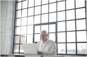 Focused senior man working on laptop in bright mod