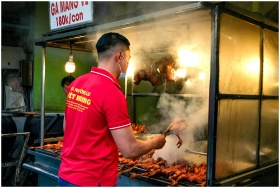 Street vendor grilling chicken with steam rising, showcasing delicious street food preparation.