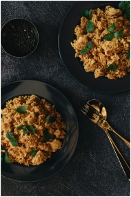 Savor the rich flavors of chicken biryani served elegantly on black plates with fresh garnish.