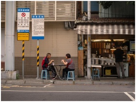 Two adults enjoying a meal at a street-side table in Taiwan.
