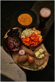 A flat lay of fresh ingredients for a hearty stew,