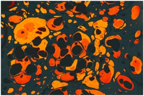 Dynamic abstract fluid art featuring bold orange and black colors with swirling patterns.