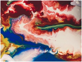 Dynamic and colorful abstract acrylic painting with swirling vibrant hues creating a fluid art expression.