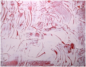 A vivid abstract pattern in red and white, highlighting textured paint strokes and creative expression.