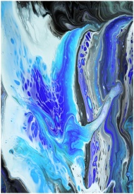 Dynamic abstract artwork featuring swirling blue, black, and white acrylic paint textures.