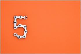 Creative arrangement of a chrome bicycle chain forming the number 5 on a vibrant orange background.