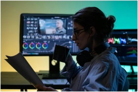 A concentrated editor sipping tea while reviewing papers in a modern editing studio.