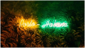 Vibrant neon sign displaying 'Porto-Habana' agains