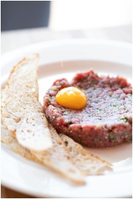 Savory beef tartare dish with raw egg yolk served
