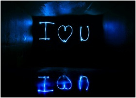 Blue neon light painting 'I love you' in a reflective dark tunnel.