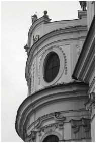 Black and white photo of ornate Baroque architecture in Salzburg, Austria.