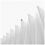 An abstract view of modern minimalist architecture featuring a bird perched atop.