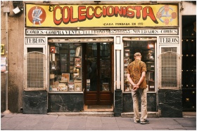 A man window shopping outside a vintage comic store in Madrid, Spain.