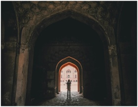 Person silhouetted against an ancient Indian monument through a gothic archway in daylight.