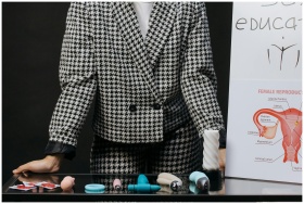 A visual setup for sex education featuring a variety of sex toys and educational materials on a glass table.