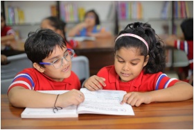 Two young children reading together in a bright classroom in Gurugram, India.