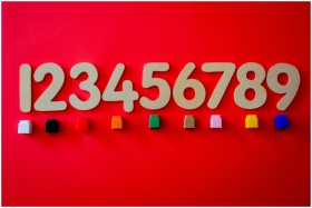 Wooden numbers with colorful cubes on a vibrant red background.