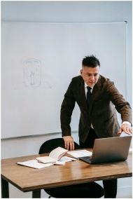 A professional man in a suit teaching online from