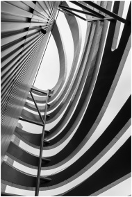 Dynamic black and white photo showcasing abstract architectural curves and lines.