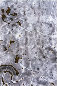 Close-up of abstract patterns formed by ice and air bubbles on a frozen surface.