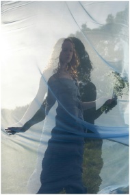 Ethereal concept of a woman in a blue dress holding flowers in an artistic double exposure shot.