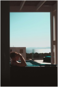 Man relaxing at an outdoor pool with a scenic ocean view in Rhodes, Greece.