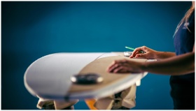 A person carefully shaping a surfboard, focusing o