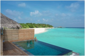 Stunning beachside view with an infinity pool, clear blue water, and a thatched-roof hut in a tropical paradise.