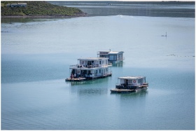 Three luxury houseboats float peacefully in the serene waters of Kraalbaai Lagoon, South Africa.