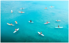 Aerial shot capturing surfers in clear turquoise waters, showcasing a tranquil and vibrant scene.