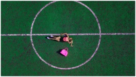 Aerial shot of a woman in stylish attire relaxing with a pink bag on a green soccer field.