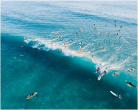 High-angle shot of surfers enjoying a vibrant day