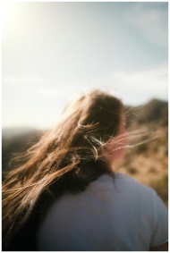 A woman with flowing hair enjoys a windy sunset at a desert landscape in California.