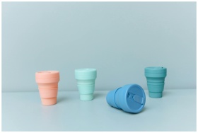 A set of pastel-colored collapsible cups promoting
