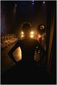 A ballerina silhouette stands on stage with a troupe of dancers in dramatic lighting.